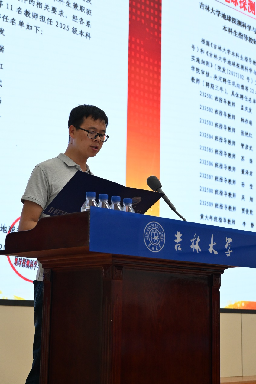 冯晅在讲话中指出,设立本科生班主任制度,是学院落实“立德树人”根本任务、构建“三全育人”工作格局的关键环节。面对初入大学、正处于人生“拔节孕穗期”的新生们,班主任、班导师是离学生最近、关怀最直接的指导者,能够及时了解学生的思想动态、学业困难和发展需求,提供精准的指导和帮助。作为专业教师,班主任、班导师能够最早、最好地将学科前沿动态、专业发展前景和地探人的使命担当传递给学生们,激发大家的科研热情,稳固专业思想,确立学术志向。冯晅希望受聘的班主任、班导师们能够坚守育人初心,做学生成长的“引路人”;发挥专业优势,做学术启蒙的“播种者”;加强沟通协作,做育人共同体的“连接器”。同时,希望2025级的全体同学们能够主动融入,积极求教,尽快适应大学学习节奏,夯实专业基础,勇于探索实践。秉承“星天地海,智能探测”的地探精神,立志为国家的能源事业和地球科学研究贡献青春力量。